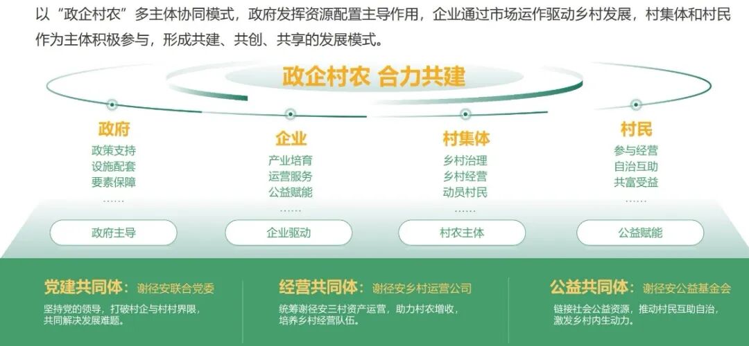 以"政企村农"多主体协同模式,政府发挥资源配置主导作用,企业通过市场运作驱动乡村发展,村集体和村民作为主体积极参与,形成共建、共创、共享的发展模式