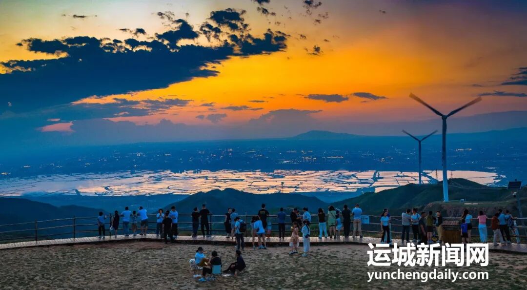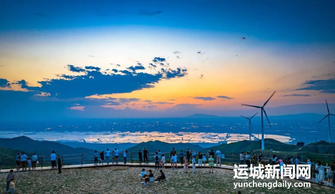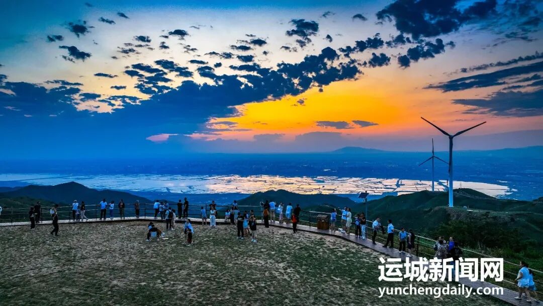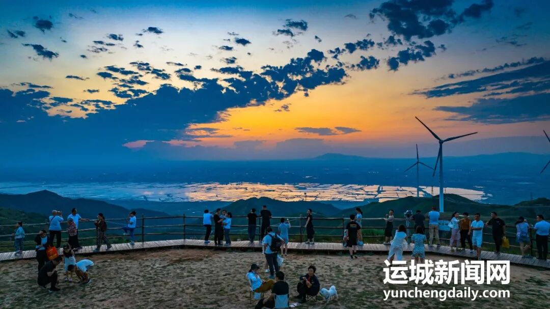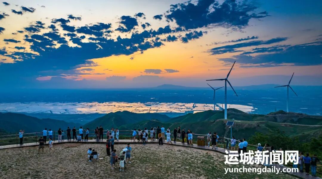 平陆县风口山国家森林康养基地观景台上,游客们纷纷驻足,欣赏七彩盐湖在落日余晖下的壮美景象,感受夏日难得的清凉。该基地位于张店镇风口村,毗邻万亩油松林,每立方厘米负氧离子含量高达6000+,被誉为“天然氧吧”。