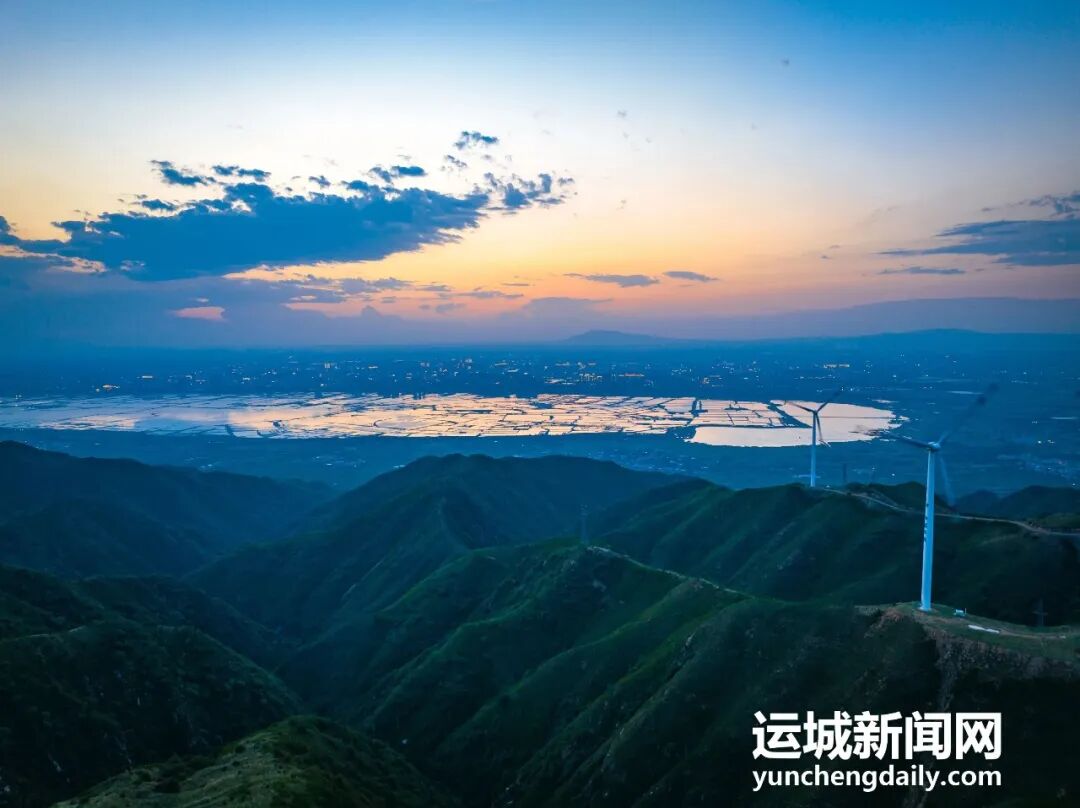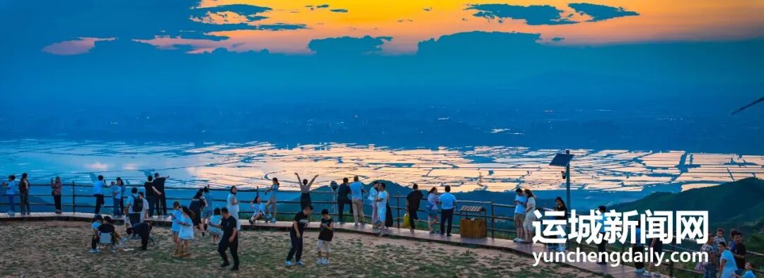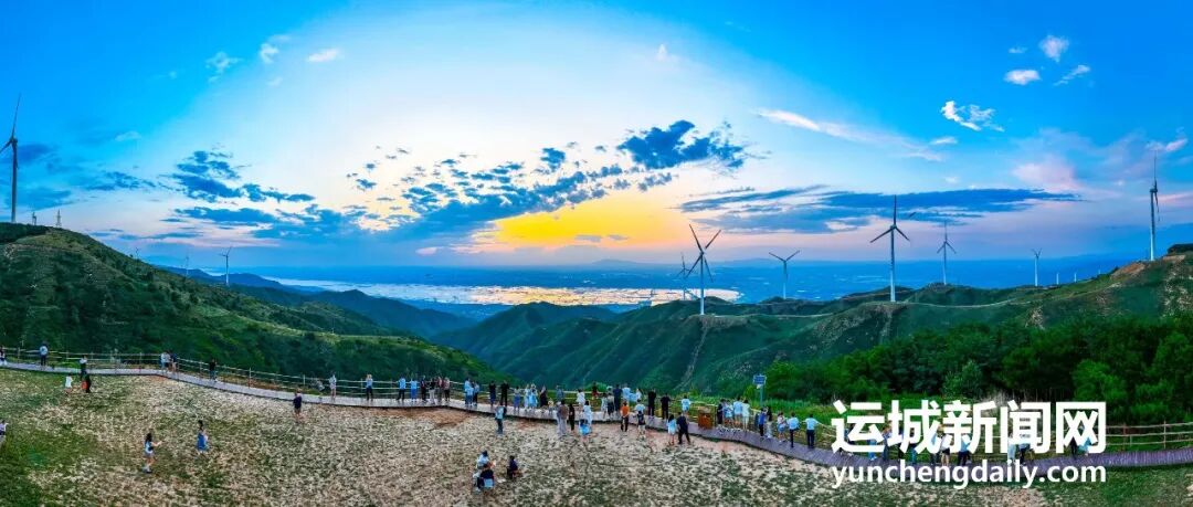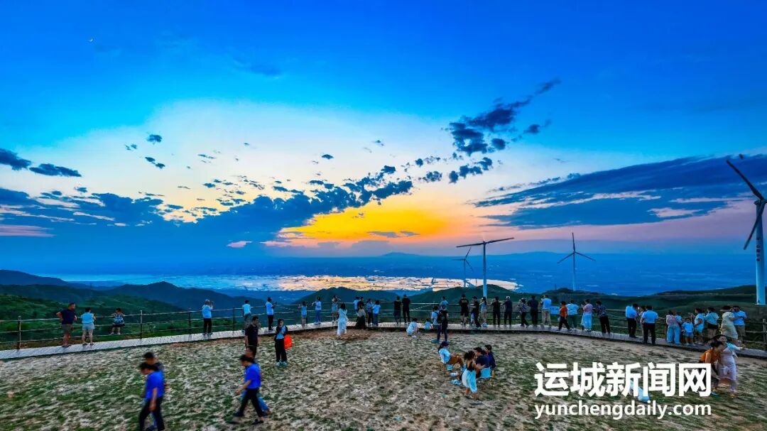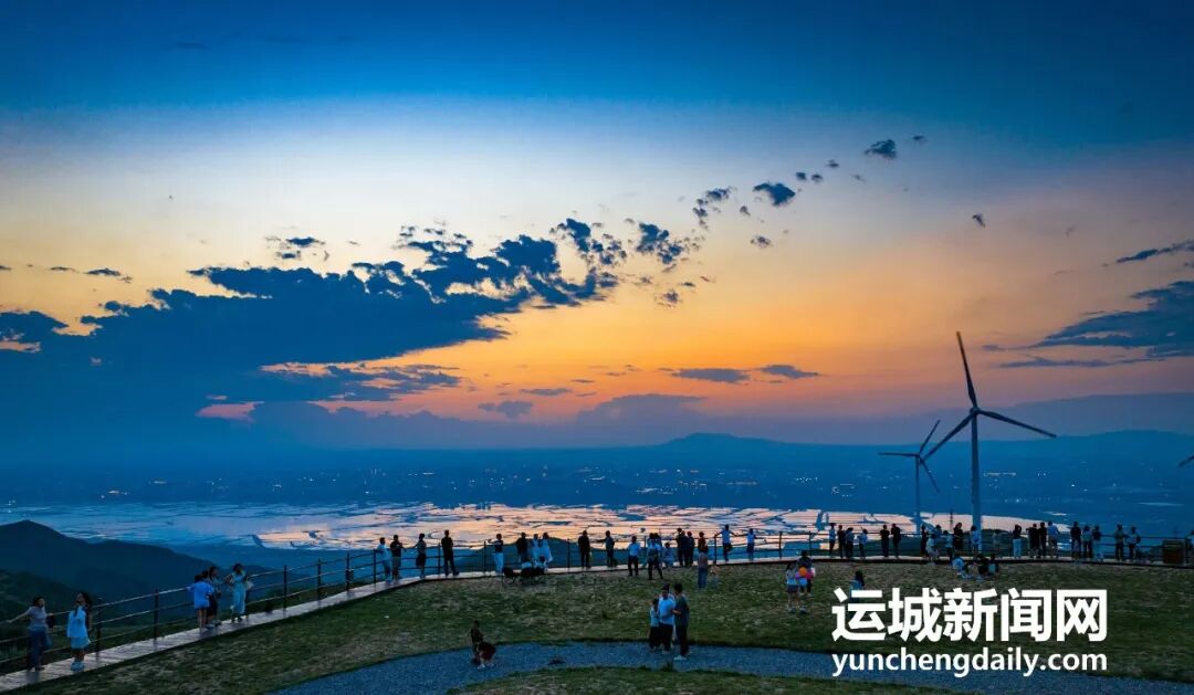 平陆县风口山国家森林康养基地观景台上,游客们纷纷驻足,欣赏七彩盐湖在落日余晖下的壮美景象,感受夏日难得的清凉。该基地位于张店镇风口村,毗邻万亩油松林,每立方厘米负氧离子含量高达6000+,被誉为“天然氧吧”。