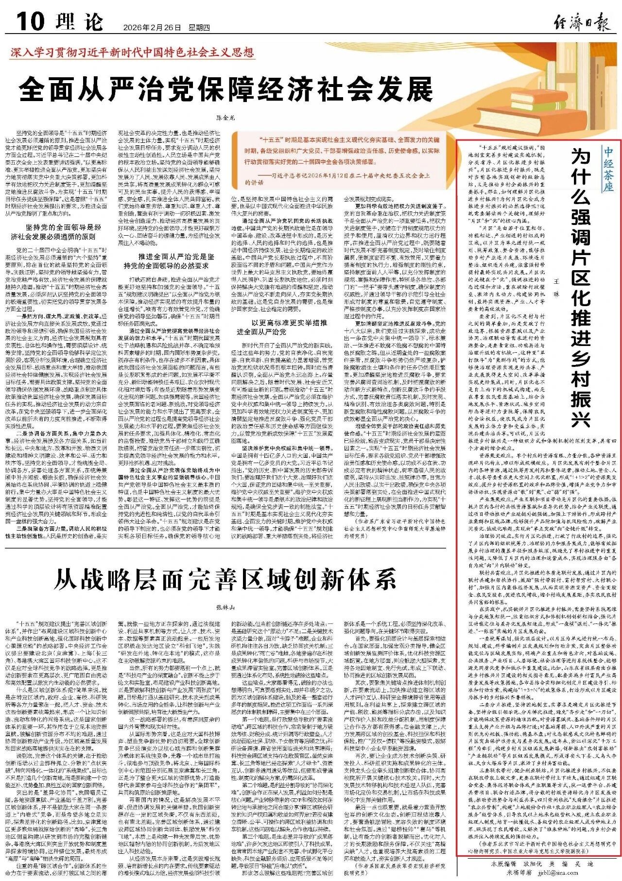 三要联农带村,健全利益联结。片区化推进乡村振兴,不仅要在联农带农上做文章,更要在联村带村上下功夫。通过组建片区联合党委、集体经济联合体或产业联盟等方式,统一运营平台、共建共营项目、联合打造品牌,将分散的村级资源转化为片区发展动能,推动资源整合与利益共享。四川崇州依托“天府粮仓”片区推进“农业共营制”,构建“土地股份合作社+农业职业经理人+农业综合服务”经营体系,引导农民以土地承包经营权入股,建立农业职业经理人制度,培育一批懂技术、善经营的农业经理人成为种地主力军,既实现了农民增收,又解决了“谁来种地”的问题,为乡村全面振兴注入持续发展的强劲动力。
