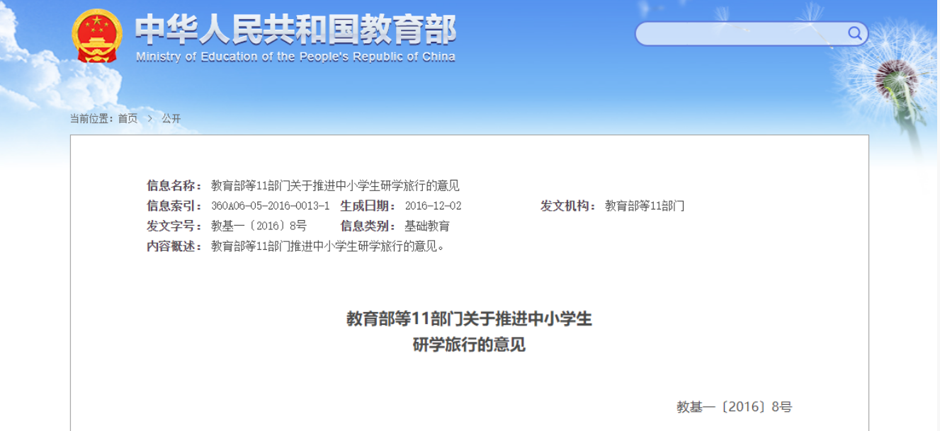 图片:《关于推进中小学生研学旅行的意见》|来源:国家教育部官网