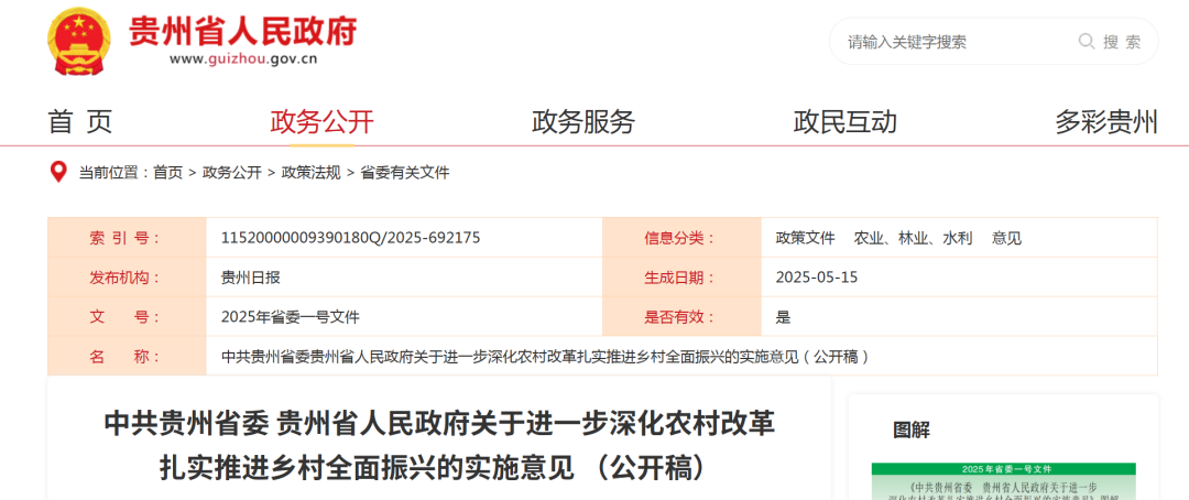 中共贵州省委 贵州省人民政府 关于进一步深化农村改革 扎实推进乡村全面振兴的实施意见 (公开稿) 做好2025年及今后一个时期“三农”工作,要坚持以习近平新时代中国特色社会主义思想为指导,深入贯彻落实习近平总书记关于“三农”工作的重要论述和关于贵州工作重要讲话重要指示精神,坚持和加强党对“三农”工作的全面领导,坚持农业农村优先发展,统筹发展科技农业、绿色农业、质量农业、品牌农业,锚定建设巩固拓展脱贫攻坚成果样板区和现代山地特色高效农业强省目标,深入学习运用“千万工程”经验,加快“四在农家·和美乡村”建设,千方百计推动农业增效益、农村增活力、农民增收入。 一、持续提升粮食等重要农产品供给保障水平 (一)深入实施粮油作物大面积单产提升行动。严格落实粮食安全党政同责,粮食播种面积稳定在4157万亩以上。深入实施粮油生产能力提升行动,在整建制推进县打造万亩高产片、千亩示范方、百亩攻关田,集成推广良田良种良机良法,力争全省粮食单产提升2%左右。 (二)做好大宗农产品稳产保供。压实“菜篮子”市长负责制,稳定生猪基础产能,推进肉牛产业提质增效,力争“四肉”产量增长2%。加强省级禽蛋保供基地建设,提高禽蛋供给能力,推动保供稳价。加快提升奶业产能,推进奶业养殖加工一体化发展。强化蔬菜保供基地建设,布局生产冬春喜温蔬菜等季节性缺口农产品,稳步提升自给水平。 (三)强化耕地保护和质量提升。严格耕地总量管控和“以补定占”,确保省域内年度耕地总量动态平衡。探索建立林耕空间置换机制,有序推进60万亩园地和林地上山、耕地下山,把具备条件的耕地建成高标准农田。持续抓好耕地“非农化”“非粮化”整治。高质量推进高标准农田建设,力争建成200万亩以上。加强传统梯田保护。 (四)加强农业科技力量协同攻关。统筹农业科研资源力量。深入实施种业振兴行动,加快崖州湾国家重点实验室贵阳粮油作物试验基地、南繁综合服务平台建设,推进水稻、玉米、油菜等突破性品种和制曲小麦、辣椒等特色品种选育。有序开展生物育种产业化,发展生物农业。加快丘陵山区适用农机研发应用与推广,提升乡镇农机社会化服务水平。支持农业经营主体数字化改造,完善“数智黔乡1+3+N”应用服务支撑体系。 (五)提升农业防灾减灾监测预警能力。新建55个病虫害监测点,加强统防统治,最大程度减轻灾害损失。实施㵲阳河、乌江等河道治理项目。加快中小河流治理项目建设,加强大中型灌区建设管理,推进中型灌区现代化改造。提升森林草原火灾综合防控能力。 (六)完善粮食生产支持政策。落实稻谷、小麦最低收购价和耕地地力保护补贴政策,持续实施大豆、油菜种植补助政策。落实政策性农业保险保费补贴政策,推动扩大稻谷、小麦、玉米、大豆完全成本保险和种植收入保险投保面积。支持马铃薯深加工和脱毒种薯繁育。支持产粮大县提升农田水利设施、农技推广体系等公共服务能力。健全农产品贸易与生产协调机制。 (七)构建食物多元化供给体系与节约长效机制。适度开发森林资源,丰富“森林粮库”。推动红托竹荪等食用菌产业提质增效。提升稻渔综合种养、大水面增殖渔业等生产水平。加强农产品检验检疫能力建设,做好重大疫病防控。开展校园食品安全专项整治。推进粮食节约和反食品浪费行动,建立健全激励约束机制。 二、持续巩固拓展脱贫攻坚成果 (八)守牢不发生规模性返贫致贫底线。常态化抓好“3+1”保障成果巩固提升。建好用好覆盖全体农村人口的防止返贫致贫监测帮扶大数据信息系统。合理确定年度监测范围,引导农户自主申报,动态消除风险。深入开展防止返贫就业攻坚行动,抓好跨省务工交通补助发放,持续强化就业帮扶车间政策支持,规范公益性岗位开发管理。持续加大产业资金奖补力度。分类明确帮扶产业推进路径和政策。深入开展“组团式”“地域+领域”帮扶。 (九)优化完善帮扶政策。开展巩固拓展脱贫攻坚成果同乡村振兴有效衔接总体评估。持续推进“三机制一制度”建设,推动工作目标、工作对象、工作方式“三转变”,探索完善过渡期后帮扶措施,丰富帮扶措施“工具箱”。创新志智双扶模式,实施技能培训“证书直补”,加强社会救助兜底保障。探索建立欠发达地区帮扶制度,统筹粤黔协作、定点帮扶、社会帮扶等机制分层分类给予支持。 (十)加强易地搬迁后续扶持。持续保障有劳动力搬迁家庭一户一人以上稳定就业。推进万人以上安置社区“一老一小”社会化服务试点、安置点物业管理实体化公司试点。持续盘活迁出地的“三块地”。规范项目实施、资金使用。 (十一)健全脱贫攻坚国家投入形成资产的长效管理机制。完善资产登记管理台账。建立帮扶项目资产管理长效机制,推动经营性帮扶项目资产收益下沉到村到户、公益性资产持续发挥作用。深化完善设施、招强引优、优化用途、灵活重组、“瘦身”增效、强化服务“六条路径”,发挥资产效益。 三、着力壮大县域富民产业 (十二)发展乡村特色优势产业。遵循自然规律和市场规律,聚焦品种品质品牌和标准化生产,省级主抓肉牛、茶叶、辣椒3个重点产业和中药材、食用菌、刺梨、油茶、竹5个优势产业,各地因地制宜发展特色产业。强化种质资源保护利