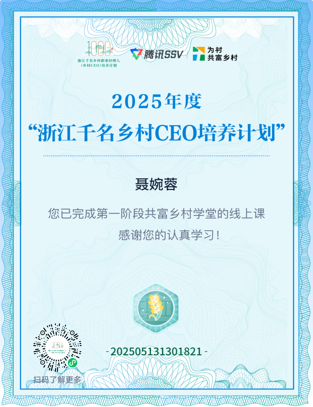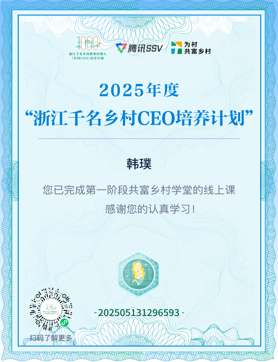 在乡村振兴的壮阔征程中,人才是推动发展的核心力量。近日,杭州余粮乡创文化旅游发展有限公司传来振奋人心的好消息:公司两位骨干,运营总监聂婉蓉,新媒体运营总监韩璞,成功入选 2025 年度 “浙江千名乡村 CEO 培养计划”,并且顺利结束了第一阶段的培训,这不仅是个人能力的认可,更是余粮乡创深耕乡村农商文旅融合发展、践行社会责任的重要里程碑。